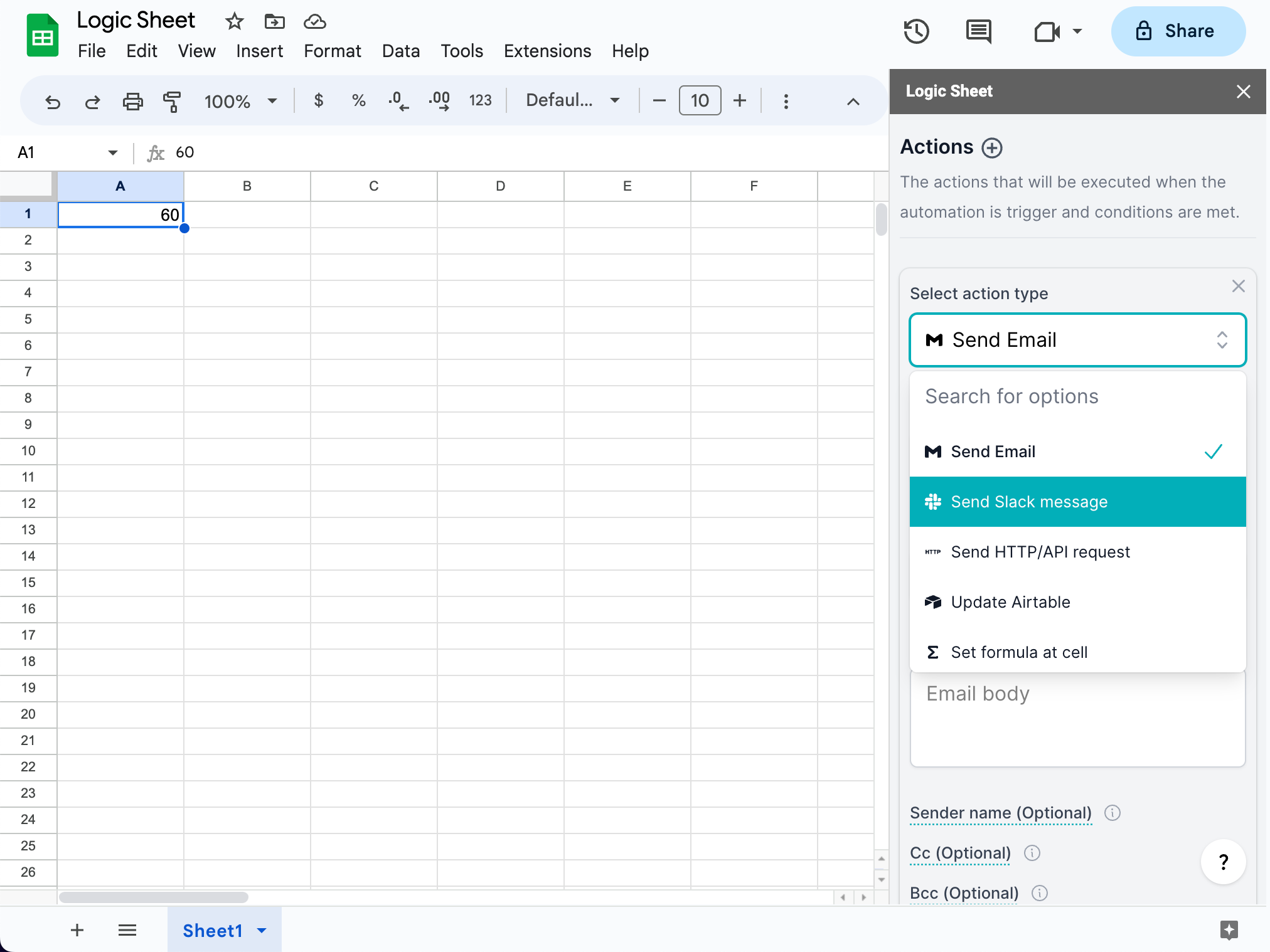 Once an automation is triggered and the conditions are met, Logic Sheet will run actions that you have set in this step.