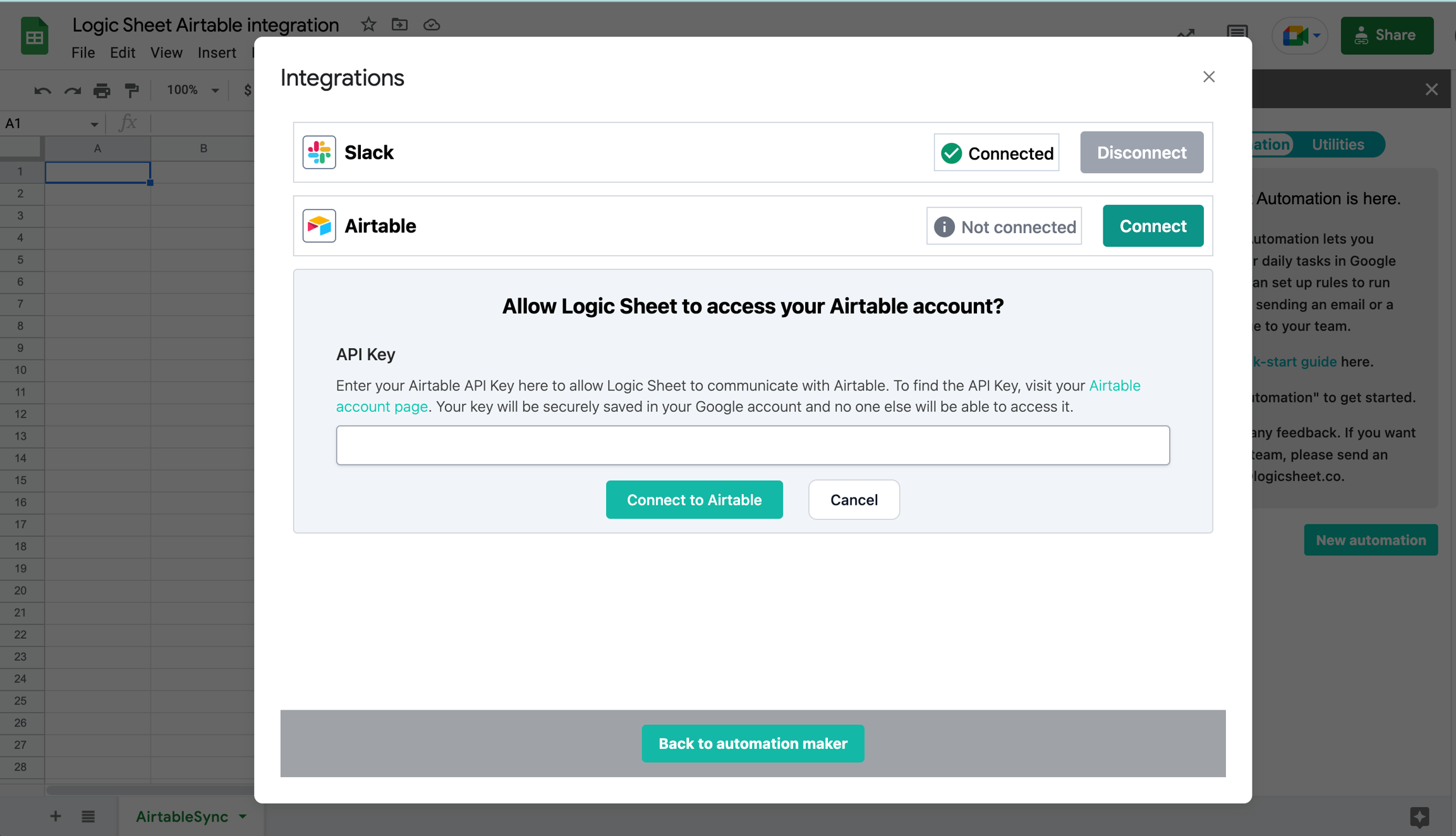 On the integration page, click on the connect button and you will be asked to input your Airtable API key. Your Airtable API key can be found or generated from your Airtable account page. Copy the API key from there and paste it into the input in Logic Sheet, and click Connect to Airtable. Your API key will be securely stored in your own Google account and cannot be accessed by anyone other than you.