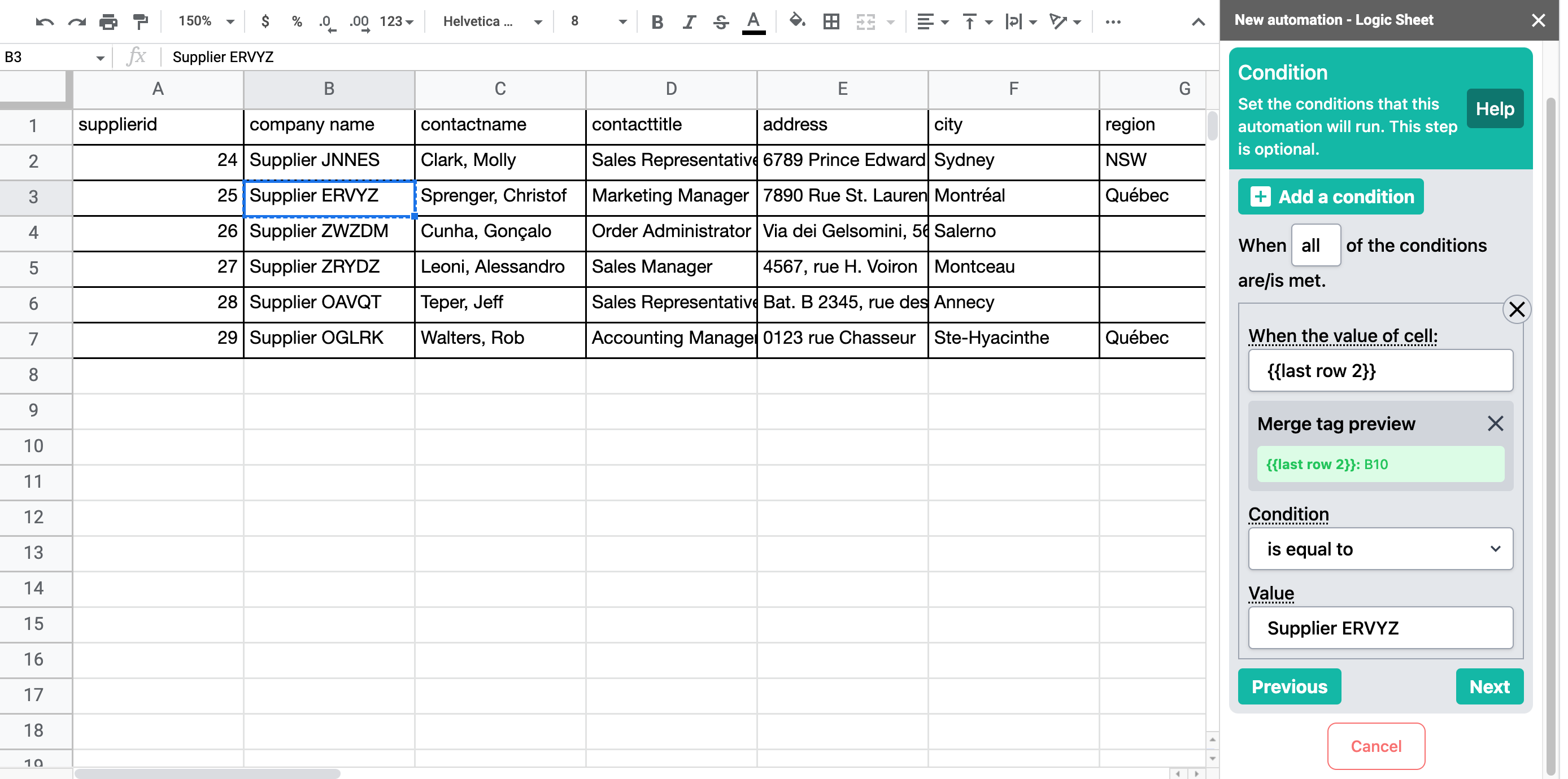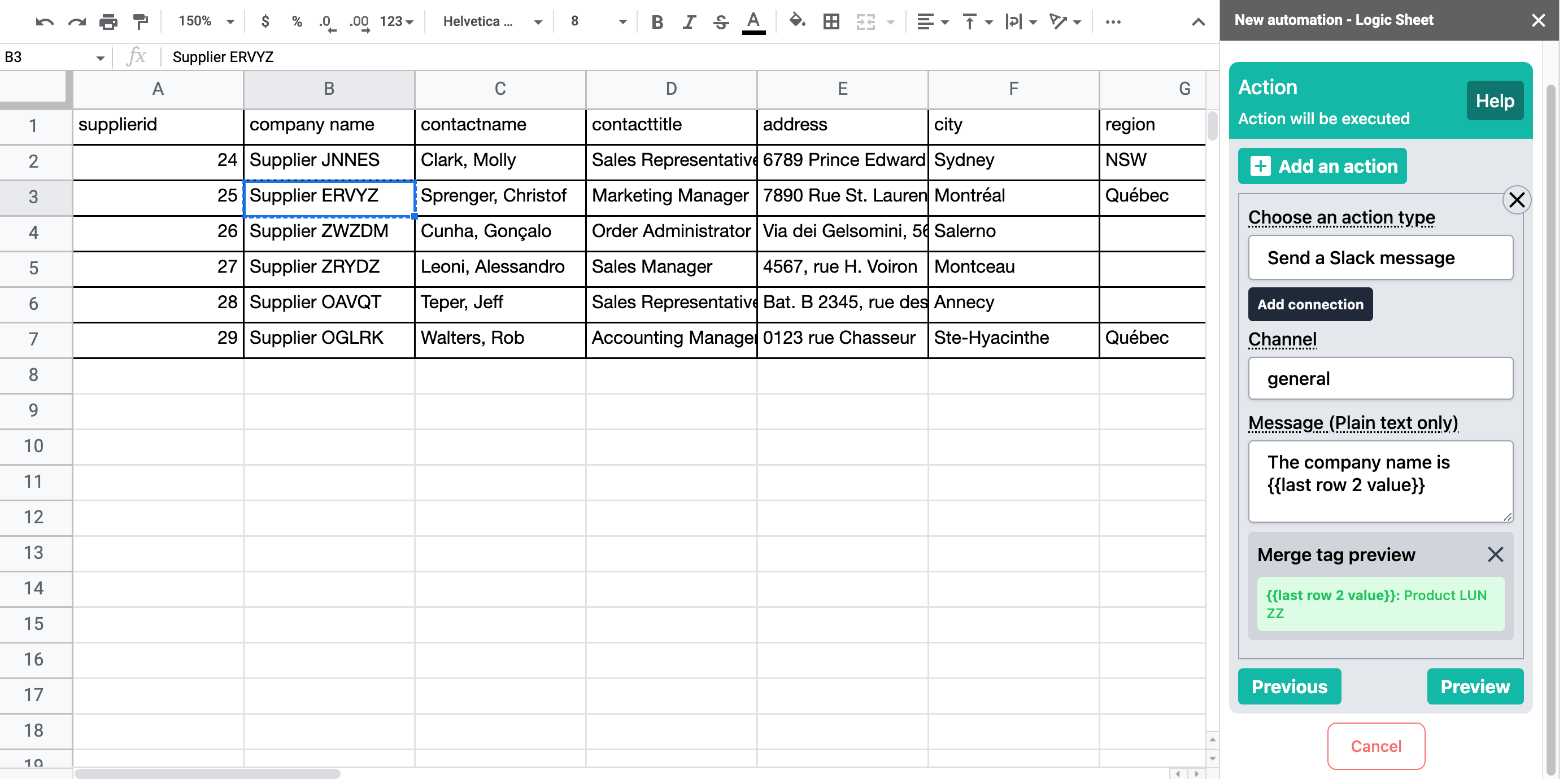 Merge tags are used to refer to dynamic data in Logic Sheet automation. When you use merge tags in fields that accept merge tags, the app will "translate" them into their corresponding values when the workflow is being executed. For example, if you use the merge tag {{range B12}} in an email, the merge tag will be replaced by the value in cell B12 when the email is sent.