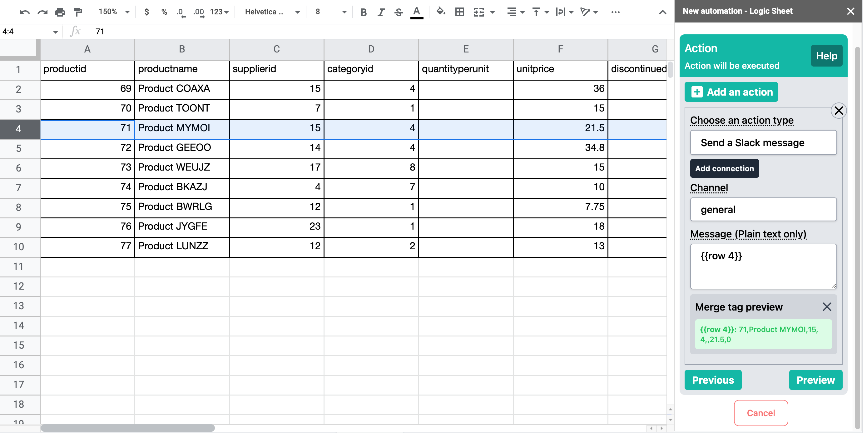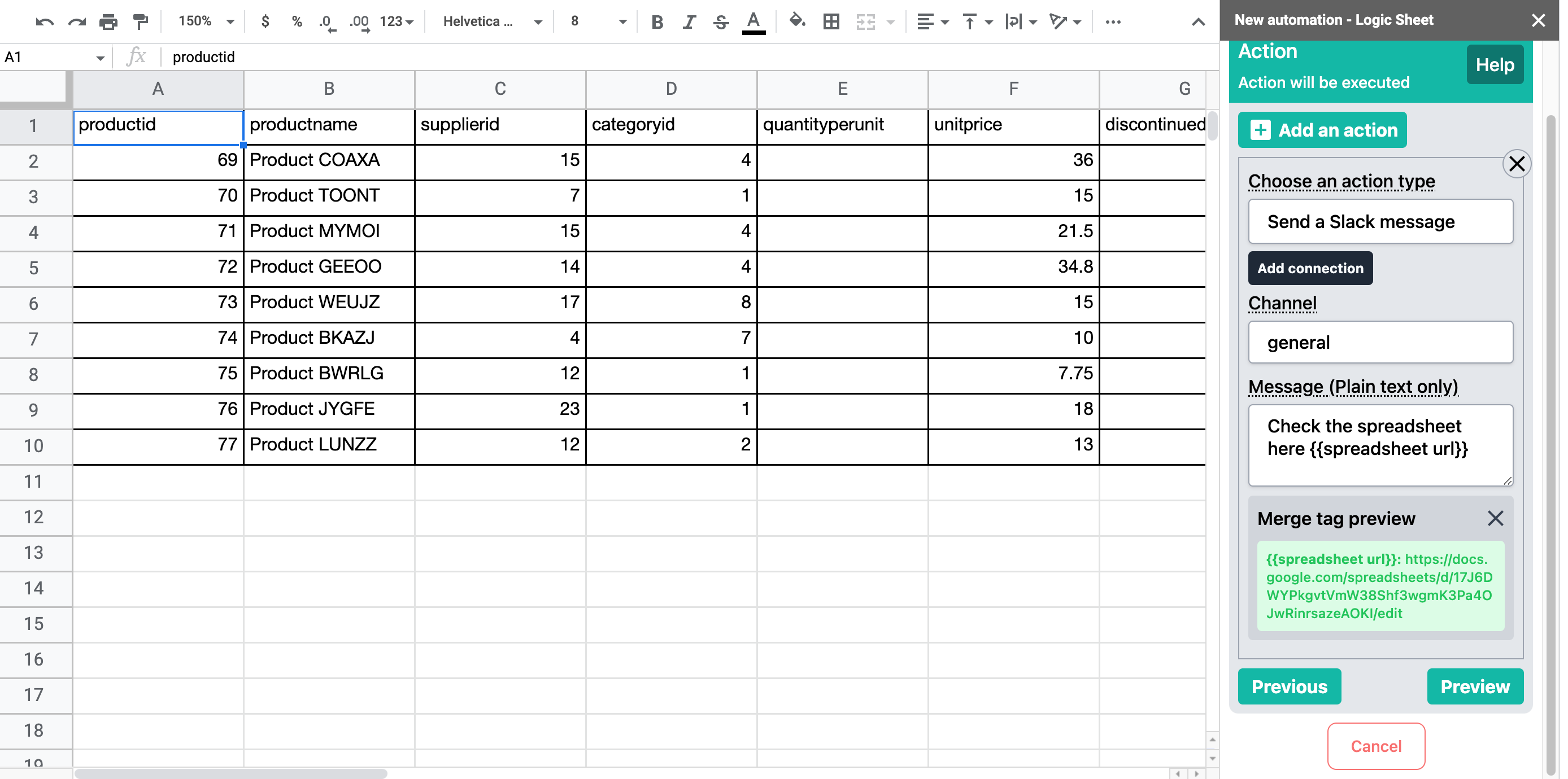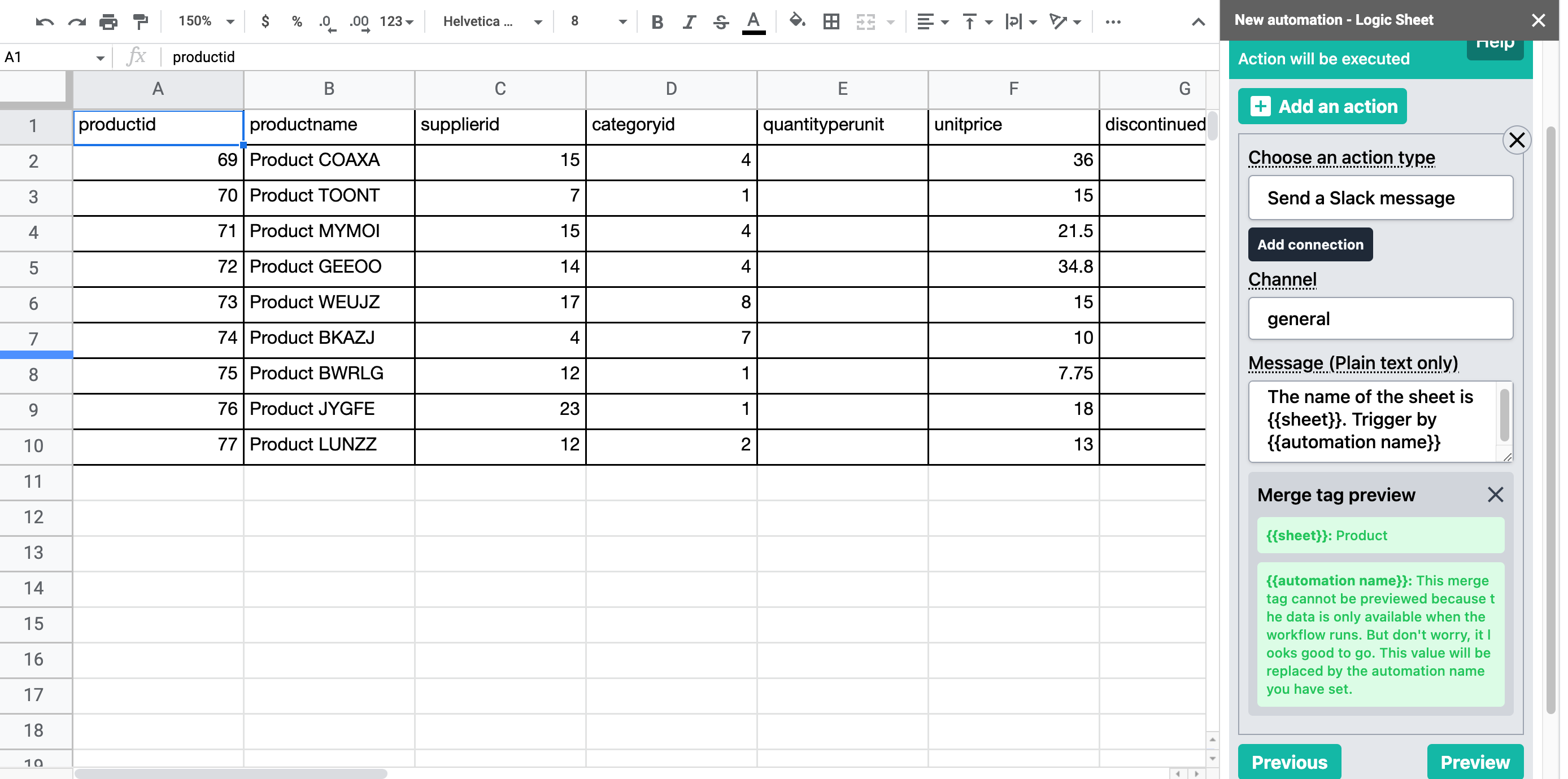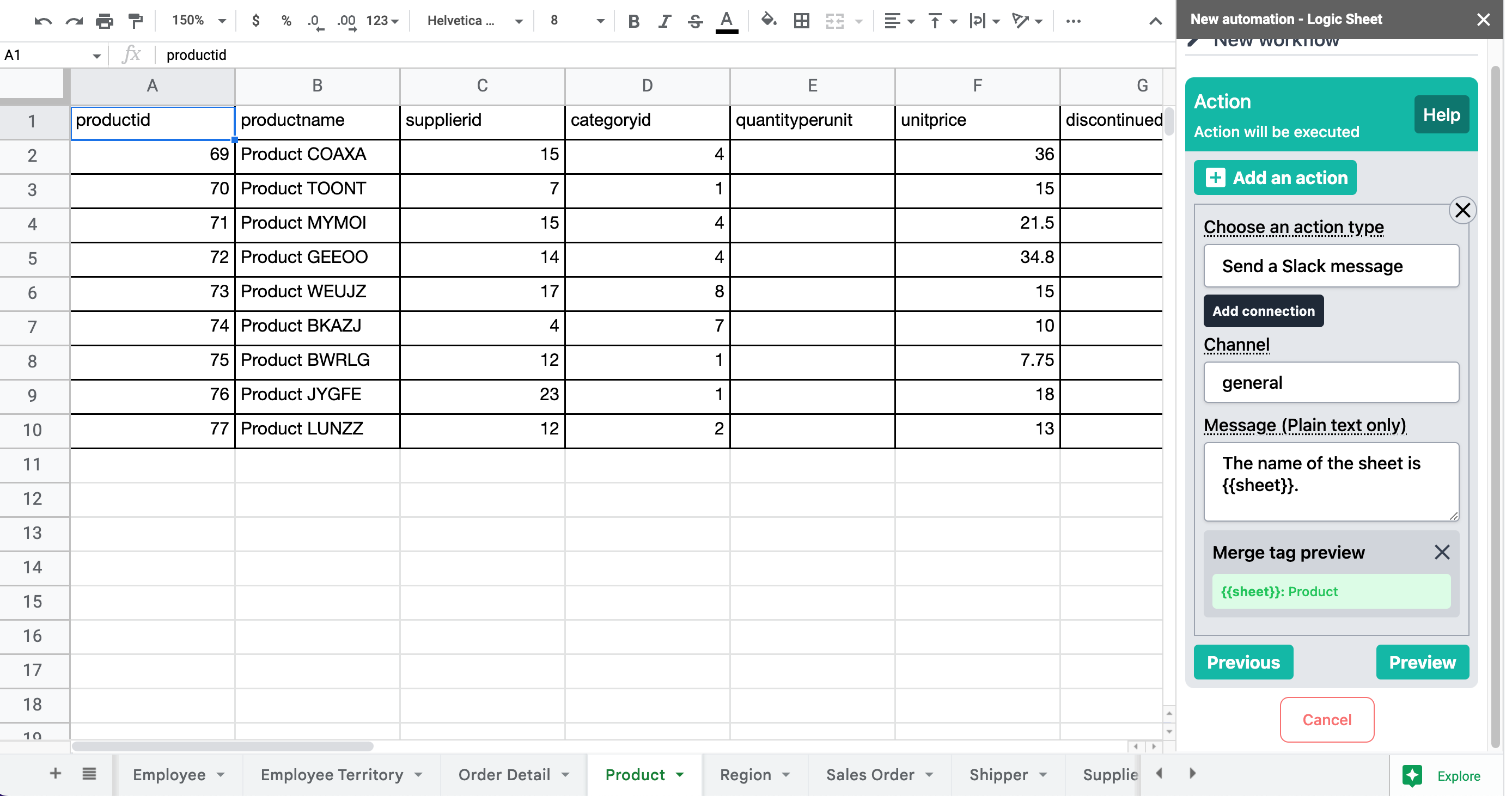 <figure><img src="https://3705758741-files.gitbook.io/~/files/v0/b/gitbook-x-prod.appspot.com/o/spaces%2F-MdWK_NNMGxKWvF0J5hL%2Fuploads%2F7Svob1EbDxREroD7bGaJ%2Fimage.png?alt=media&#x26;token=bd6601da-1181-49c5-8fa5-44c072081a41" alt=""><figcaption><p>The merge tag {{sheet}} in this example returns the worksheet name "Product".</p></figcaption></figure>