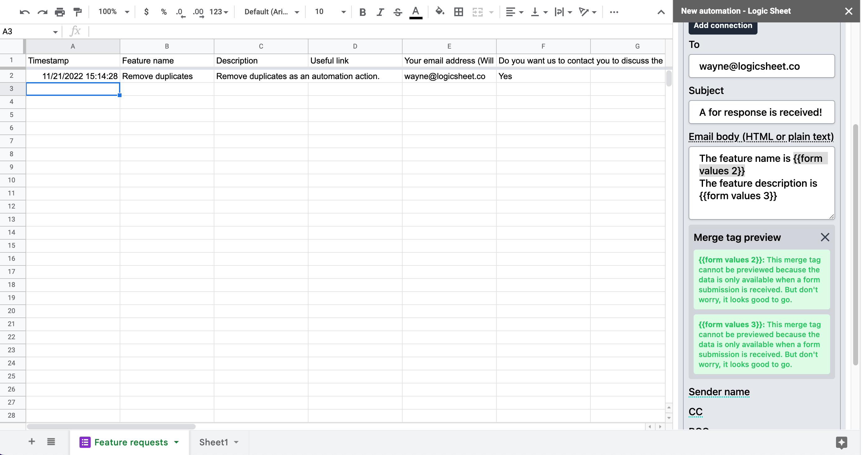 In the above example, we are using a Google Form to receive feature requests. When the automation is triggered, {{form values 2}} will return the second value of the form response, or the Feature name, and {{form values 3}} will return the Description of the feature requested.