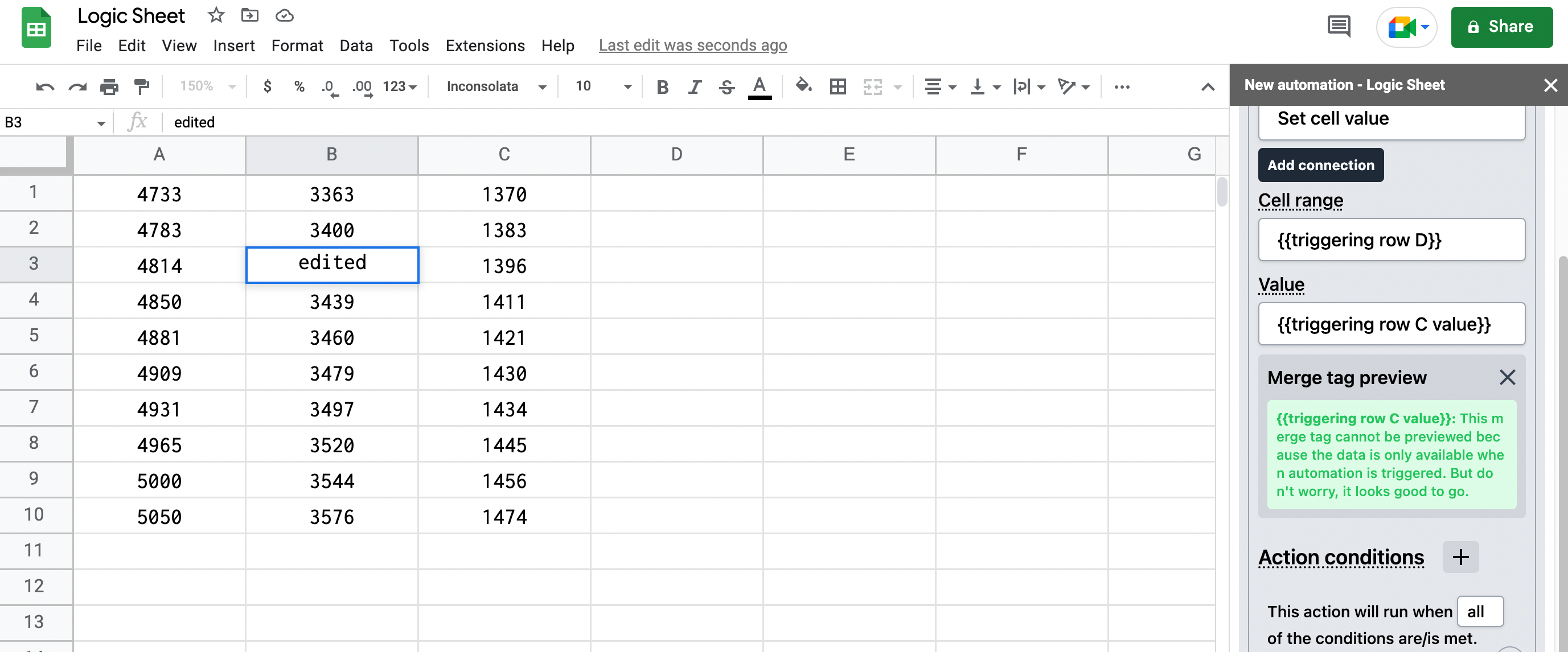 &#x20;In the following example, if the automation was triggered by an edit in range B3, {{triggering row C value}} will be the value of range C3, or 1396. {{triggering row C}} will return the range name of C3.